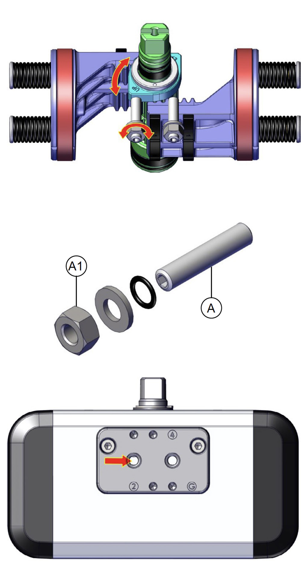 A) Assurez-vous que le filtre soit installé sur le trou 4 et qu'il ne soit pas bloqué. Assurez-vous qu'il n'y a pas d'air sous pression dans l'actionneur (dans aucune des deux chambres).