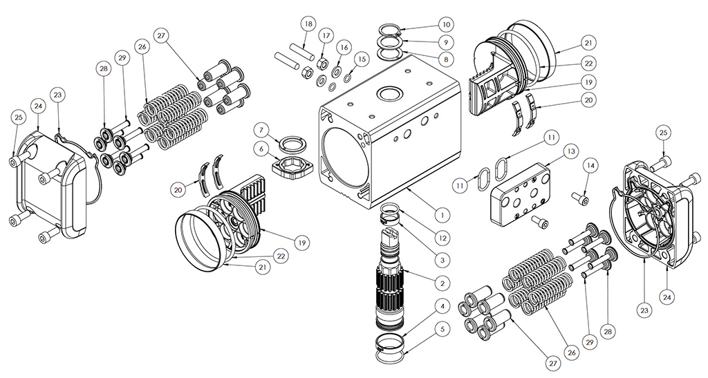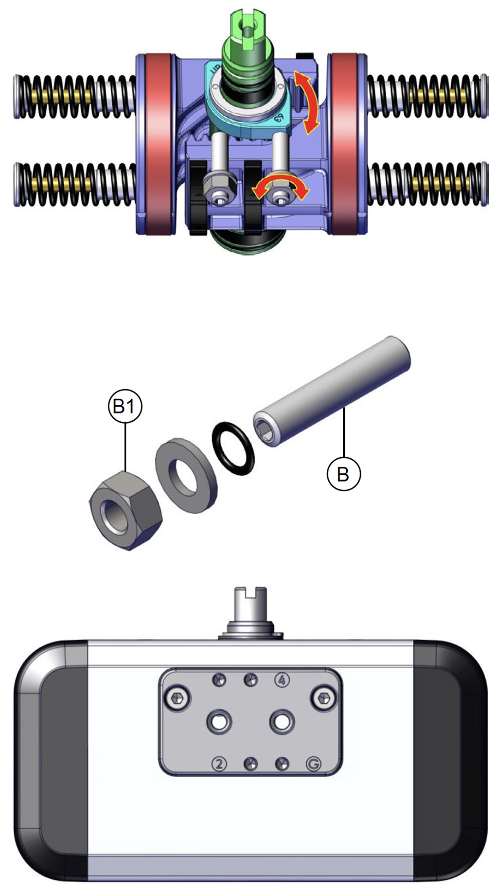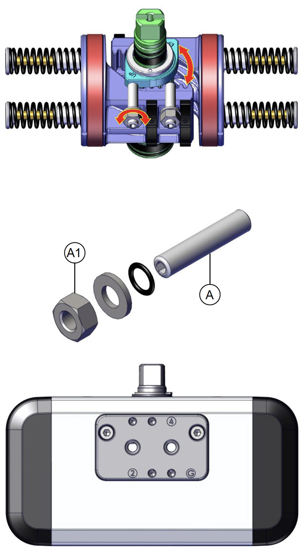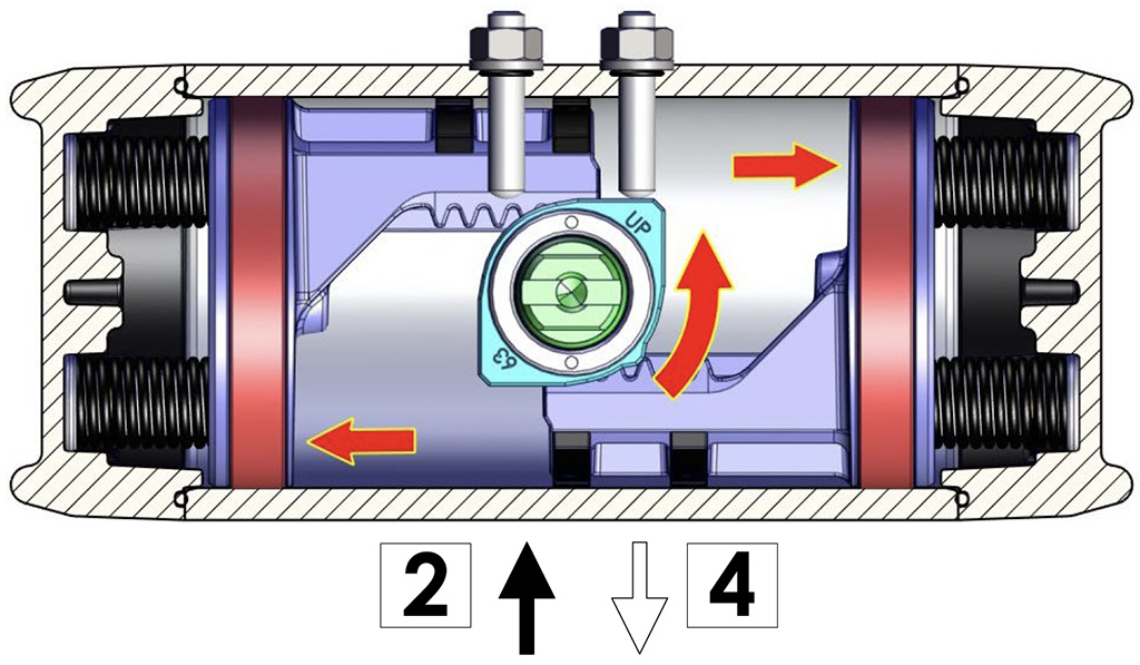 Sans pression d'alimentation, dans la version simple effet, l'actionneur revient automatiquement à sa position de repos en effectuant une rotation de l'arbre dans le sens inverse des aiguilles d'une montre et la position finale est celle indiquée sur le dessin. Il est conseillé de placer un filtre de petite taille sur le trou 4 afin d’empêcher la poussière ou les particules solides de pénétrer dans la chambre du cylindre sans toutefois empêcher le passage de l’air.