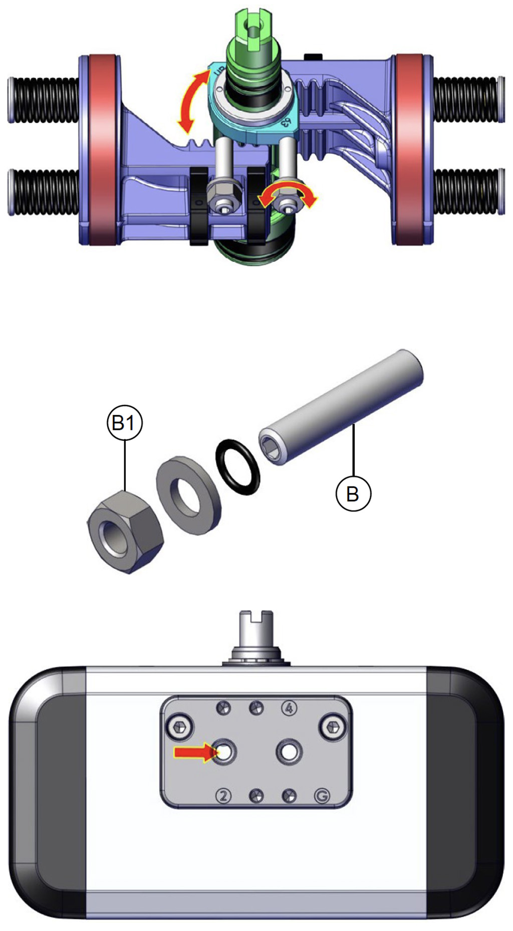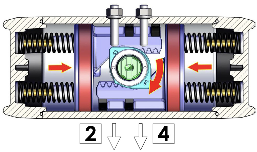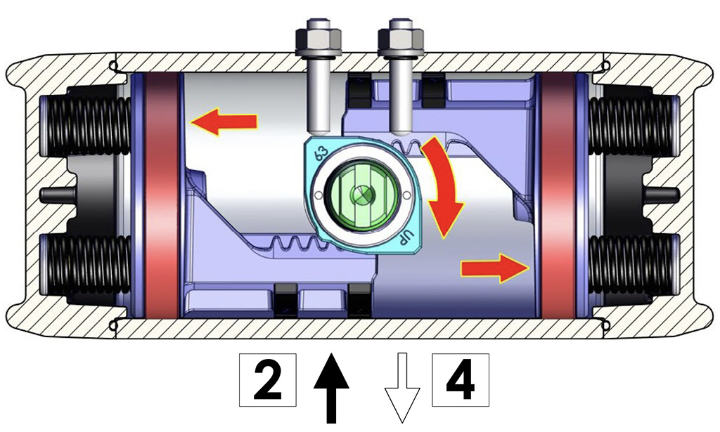 Sans pression d'alimentation, dans la version simple effet, l'actionneur revient automatiquement à sa position de repos en effectuant une rotation de l'arbre dans le sens des aiguilles d'une montre et la position finale est celle indiquée sur le dessin. Il est conseillé de placer un filtre de petite taille sur le trou 4 afin d’empêcher la poussière ou les particules solides de pénétrer dans la chambre du cylindre sans toutefois empêcher le passage de l’air.